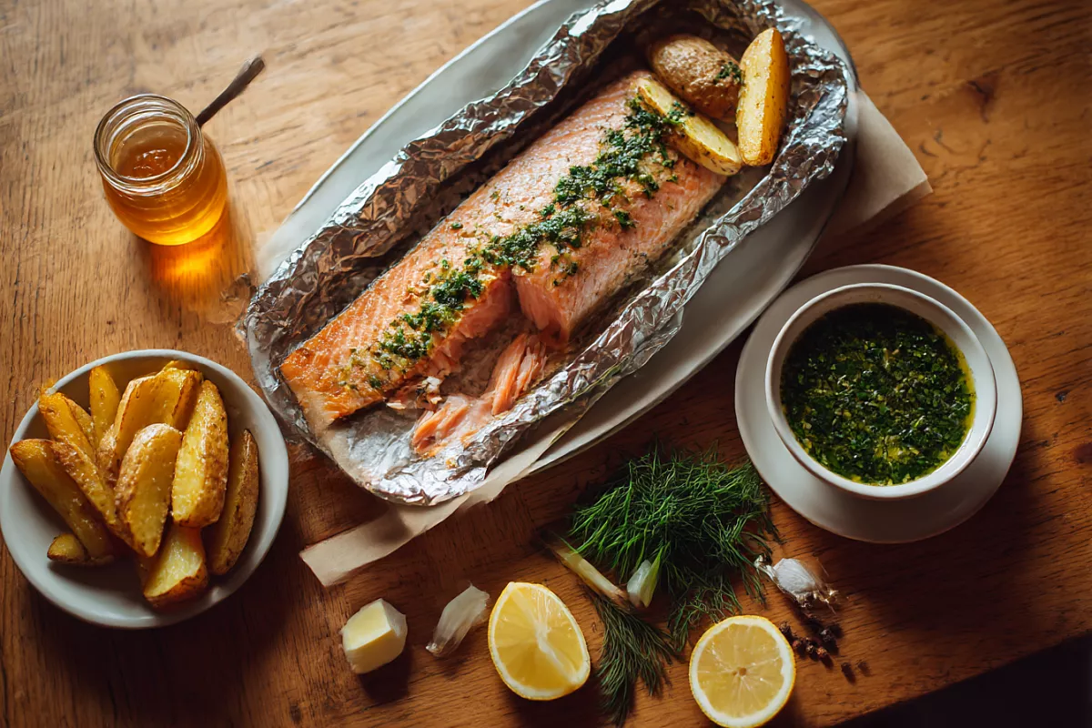 Масло с зеленью и цедрой делает рыбу сочной — всё внутри фольги. Не солите заранее — соль вытянет влагу. Мандариновая цедра даёт лёгкий аромат, лучше лимона. Сок из фольги — основа соуса, с мёдом и зеленью он идеальный. Последние минуты без фольги — для корочки.