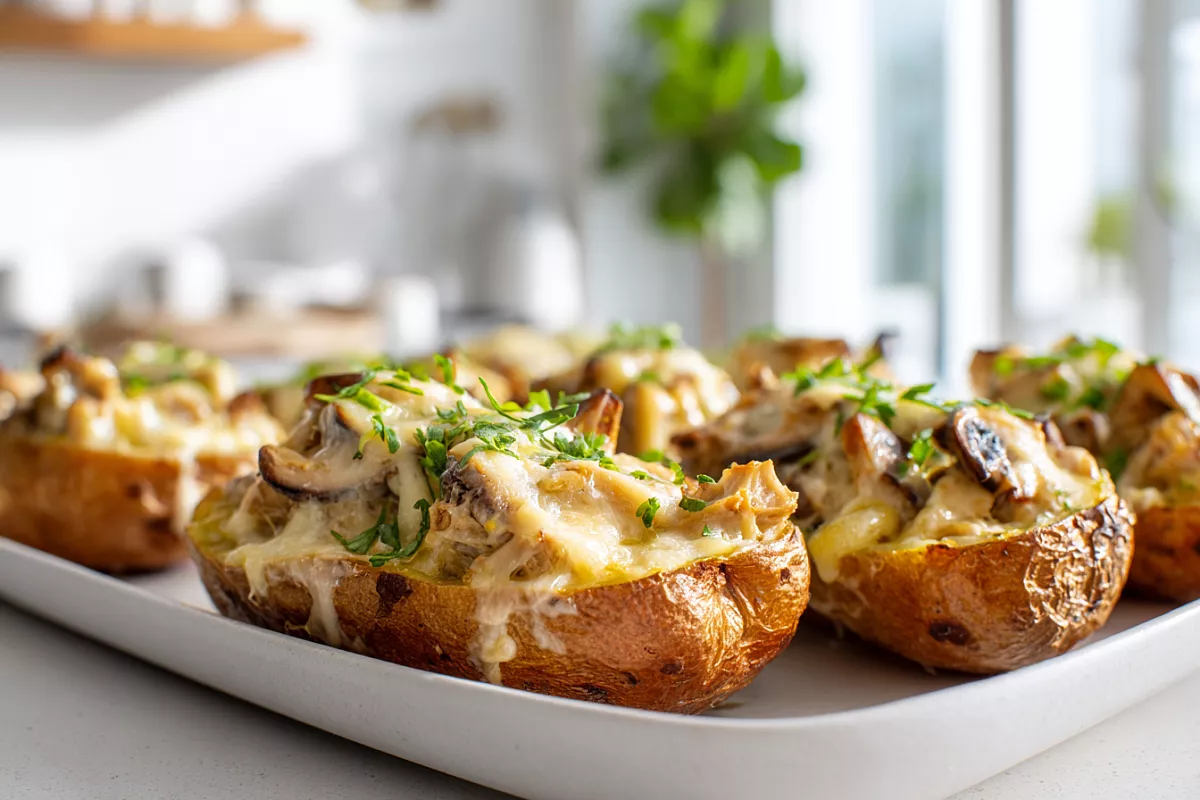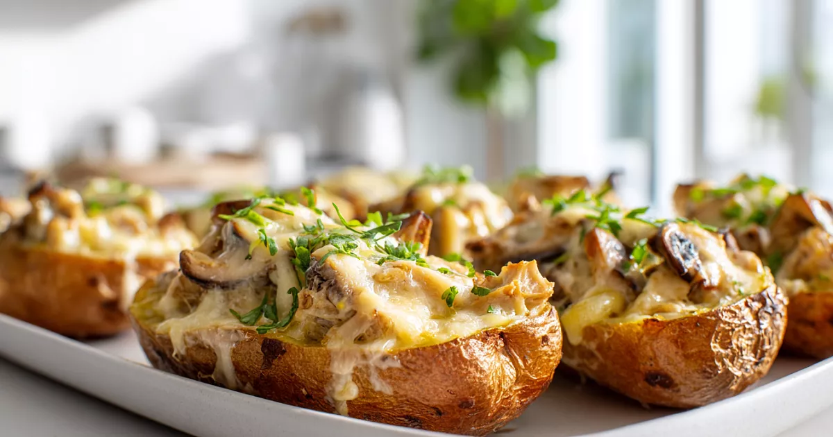 Эти аппетитные лодочки из картофеля с ароматной начинкой из курицы, грибов и сливочного соуса выглядят празднично, а готовятся просто.