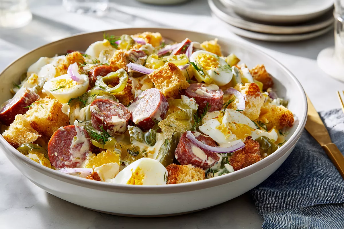 Делимся любимым рецептом салата с сервелатом и чесночно-горчичной заправкой.