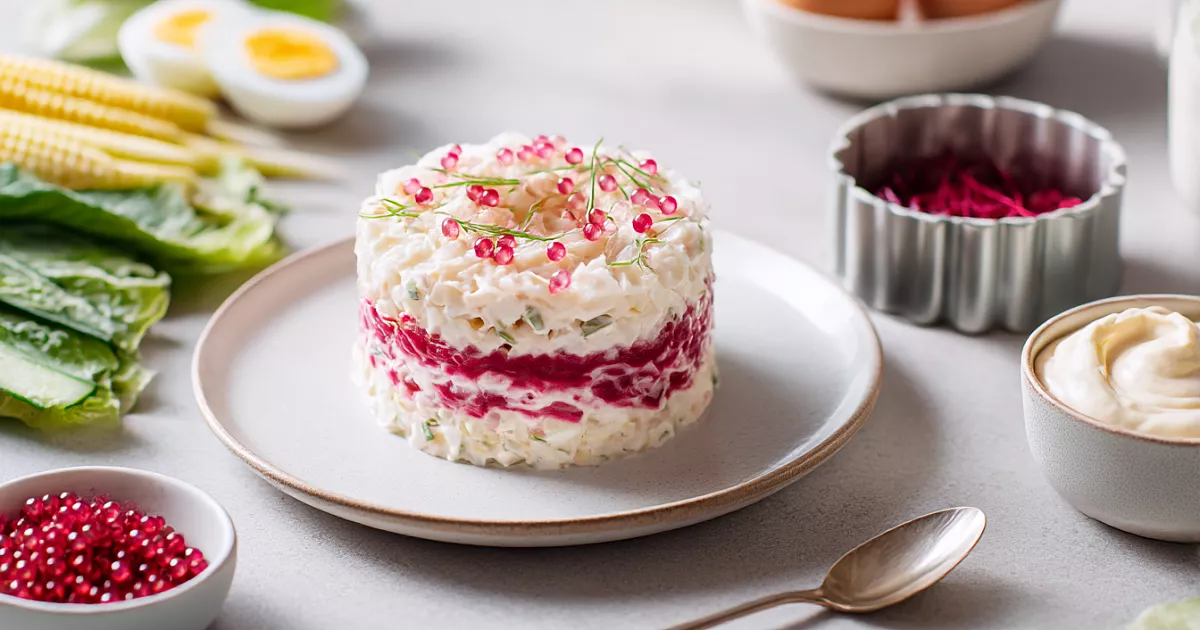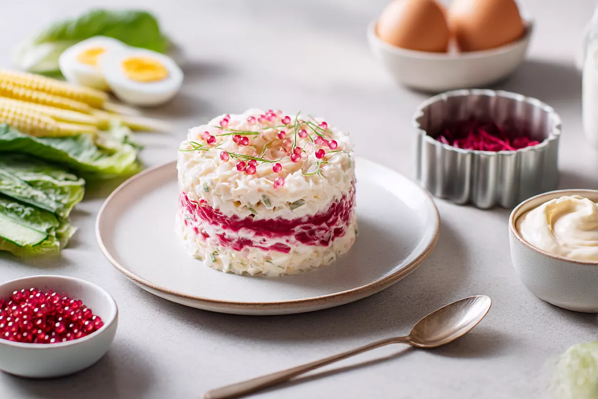 Огурец обязательно освобождайте от семенной части и подсаливайте на салфетке — это спасает текстуру. А свекольным майонезом можно «рисовать» настроение: промазывать слои понемногу, чтобы и вкус остался крабовым, и подача стала нарядной.