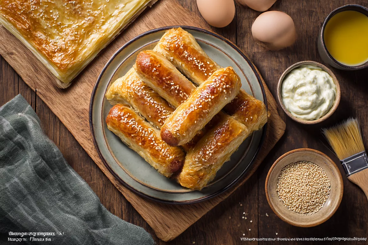 Выложите рулетики на противень с бумагой. Смешайте желток, щепотку соли и капельку воды (можно молоко). Смажьте и щедро присыпьте кунжутом.