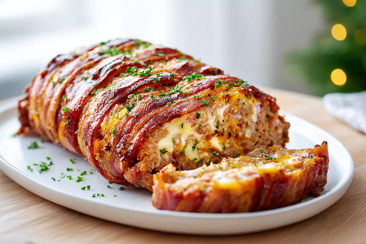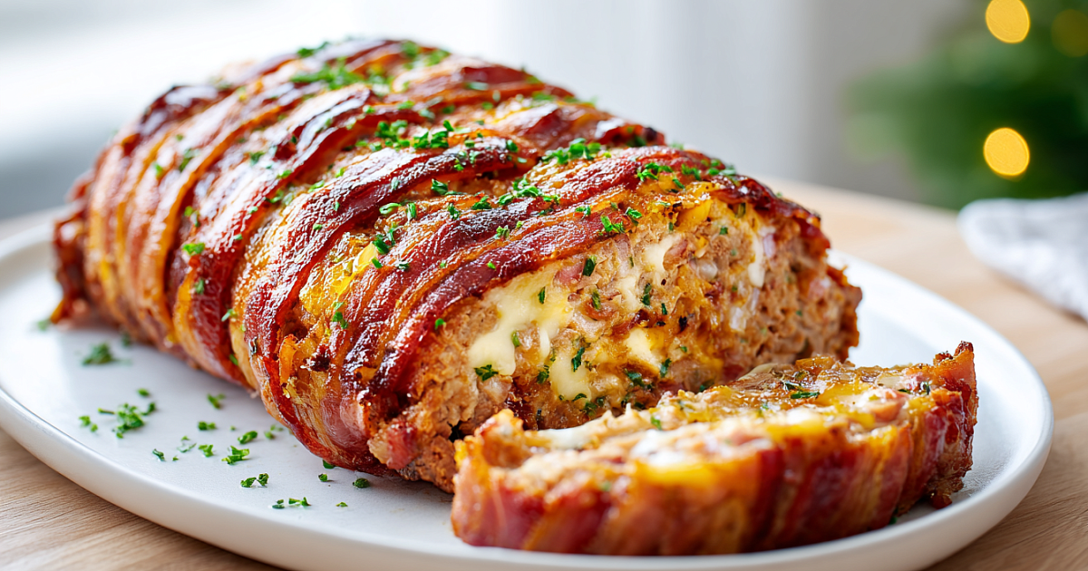 Этот эффектный рулет из фарша с начинкой из сыра, ветчины и жареного лука в обертке из бекона выглядит как дорогой деликатес.