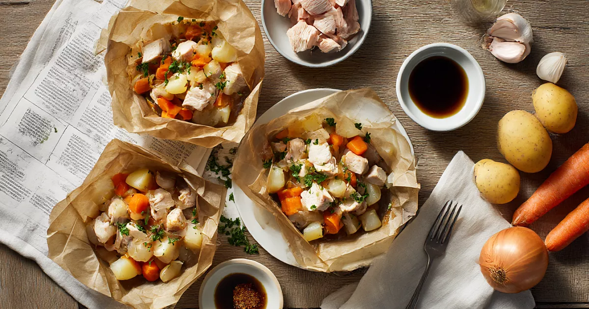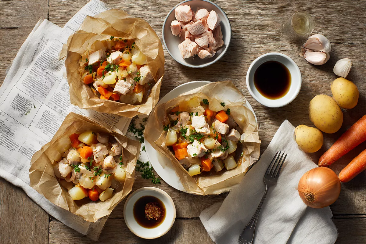 Быстрый ужин без духовки: четыре пергаментных «мешочка» на сковороде, а внутри — курица, овощи и ароматная заправка с соевым соусом.