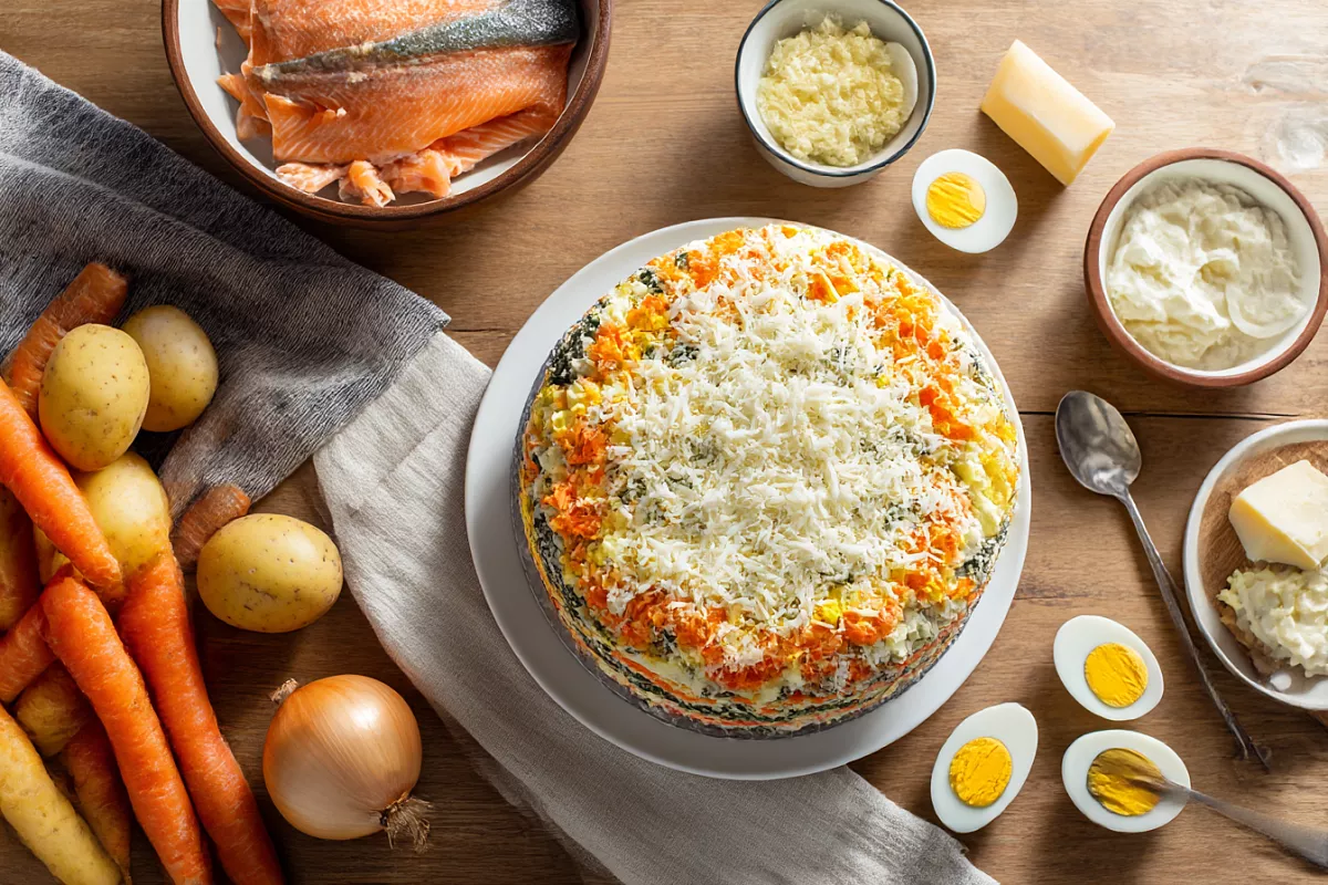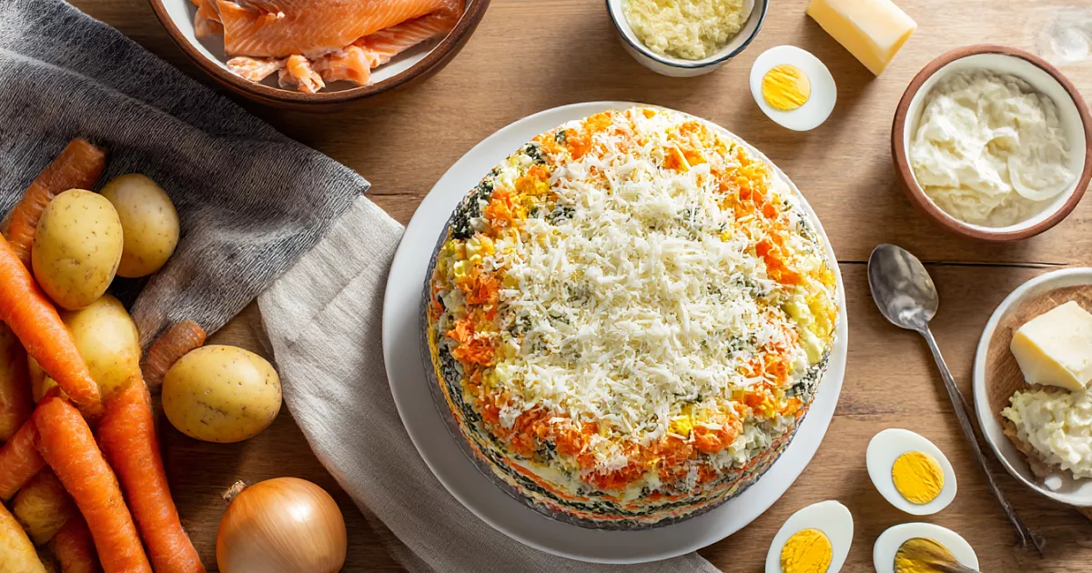 Та самая «Мимоза», только наряднее: слои, кольцо и маленькие хитрости.