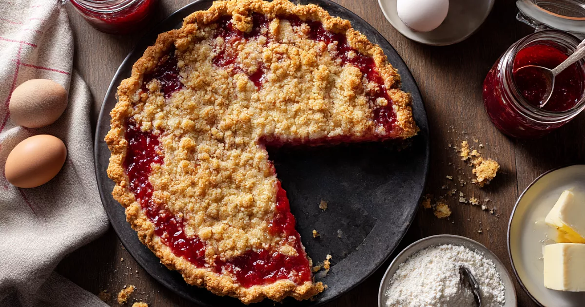 Этот пирог — настоящая классика: тонкий нижний слой, сочная начинка и рассыпчатая крошка сверху. Ничего сложного, всё делается быстро и без лишней возни, а аромат ванили и клубничного джема разносится по всей кухне уже во время выпечки.