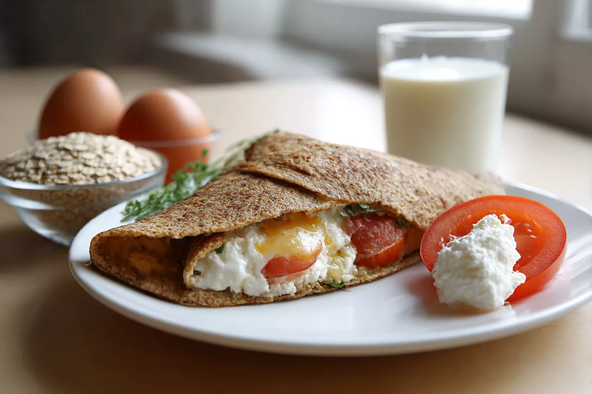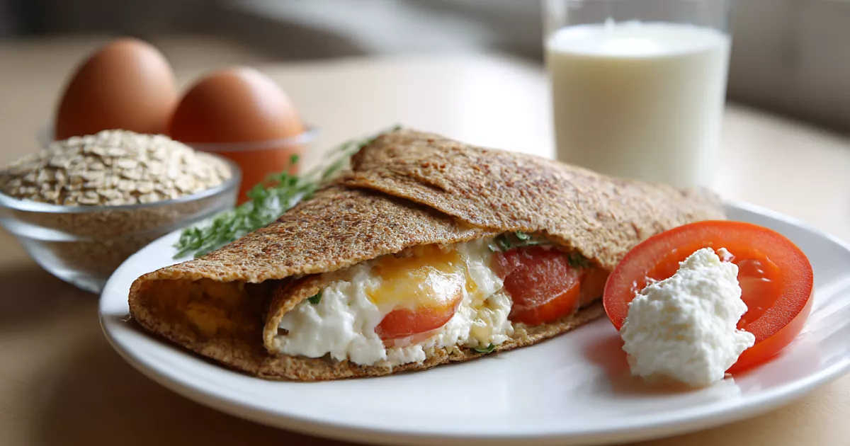 Отправляем к яйцам намоченный геркулес и добавляем одну столовую ложку творога. Именно творог делает структуру блинчика намного мягче и нежнее.