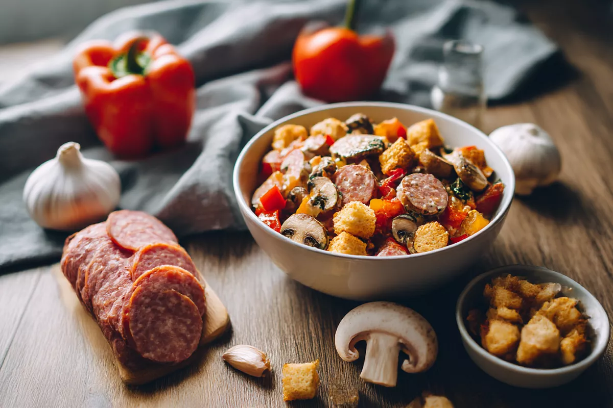 Тут всё максимально просто: горячие грибочки, яркие овощи, сухари — и получается салат с красивой изюминкой и лёгкой остринкой.