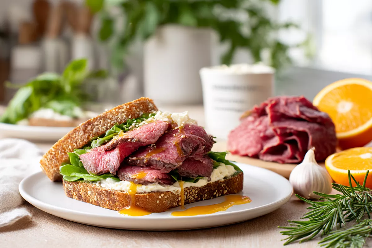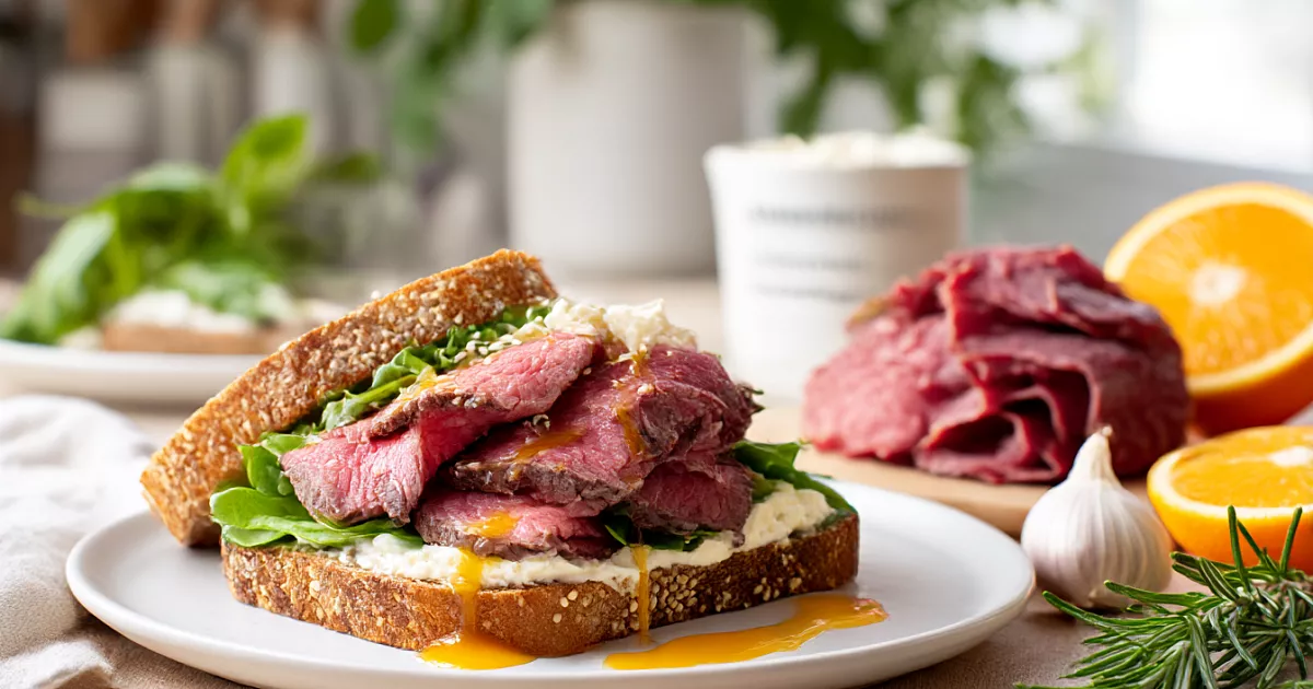 Собираю: намазка на хлеб, зелень, тонкие ломтики ростбифа и сверху немного заправки. Получается сочный, нежный, очень праздничный завтрак, который хочется повторять.