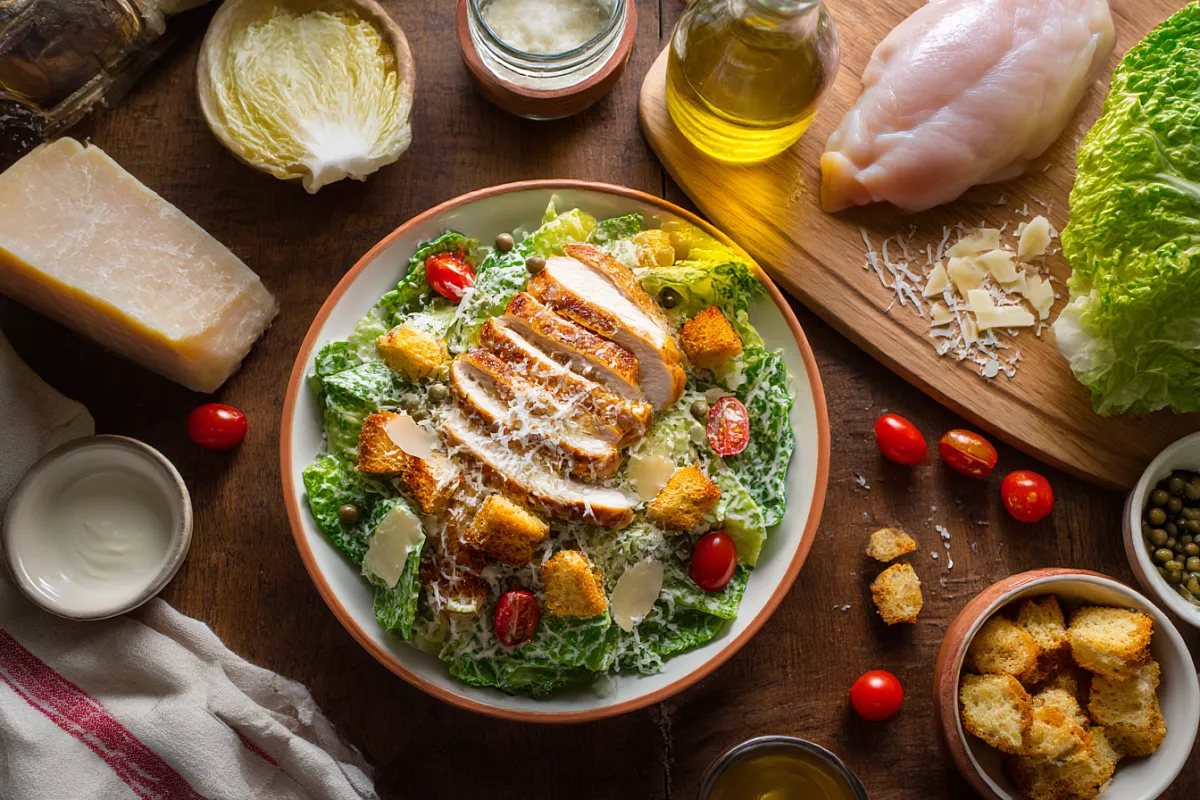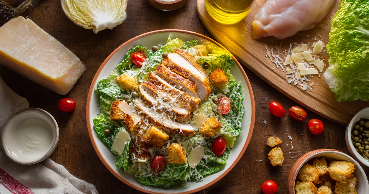 Этот «Цезарь» собирается легко, а на столе выглядит как праздник: мясо сочное, листья хрустят, соус с пикантной кислинкой.