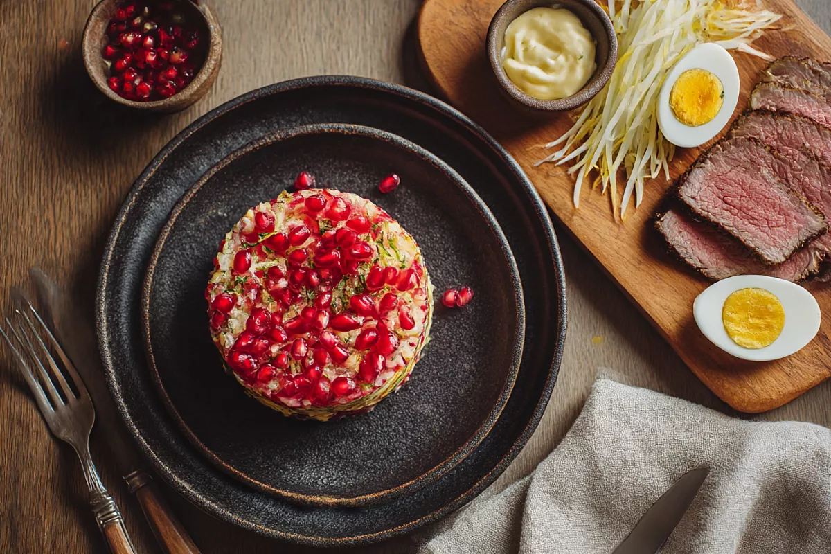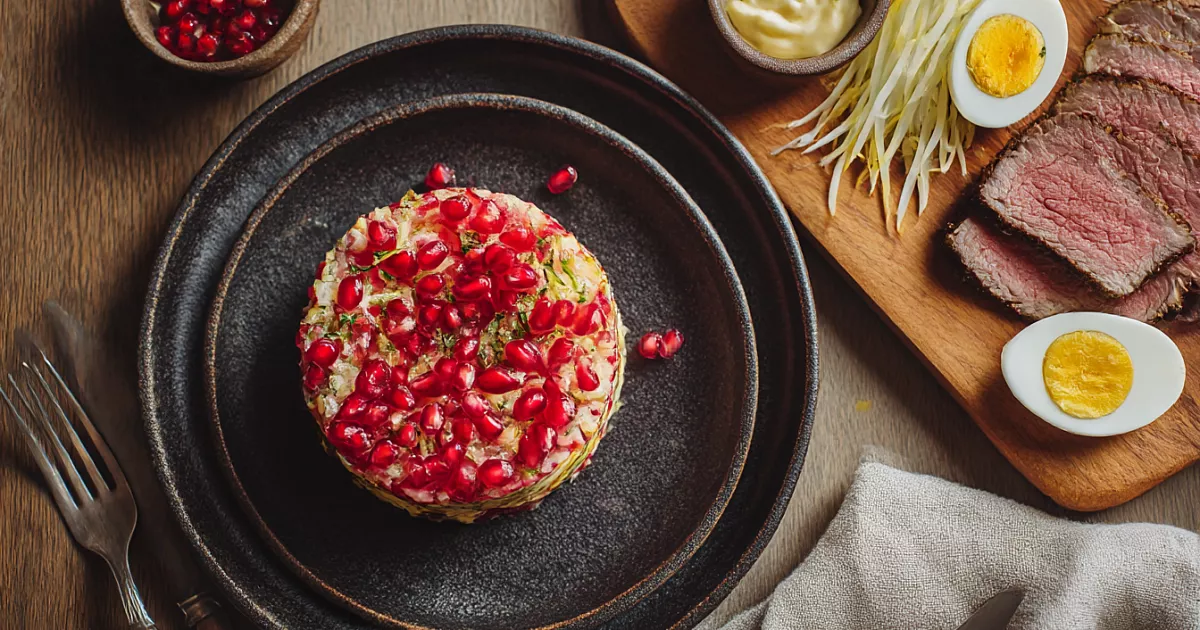 Подача для праздника простая: утрамбовываем в кольцо, поднимаем — и салат держит форму. Сверху украшаем гранатом. Да, косточки могут попадаться на зуб, зато вкус — сочный, яркий, праздничный.