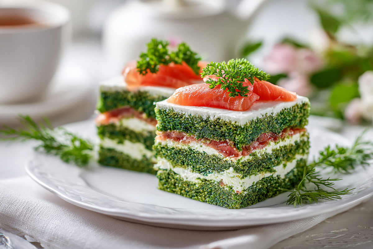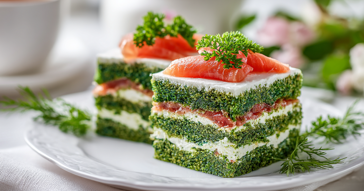 Этот эффектный закусочный торт из шпинатного бисквита с творожным кремом и красной рыбой выглядит празднично, а готовится быстро и просто — без сложной выпечки.