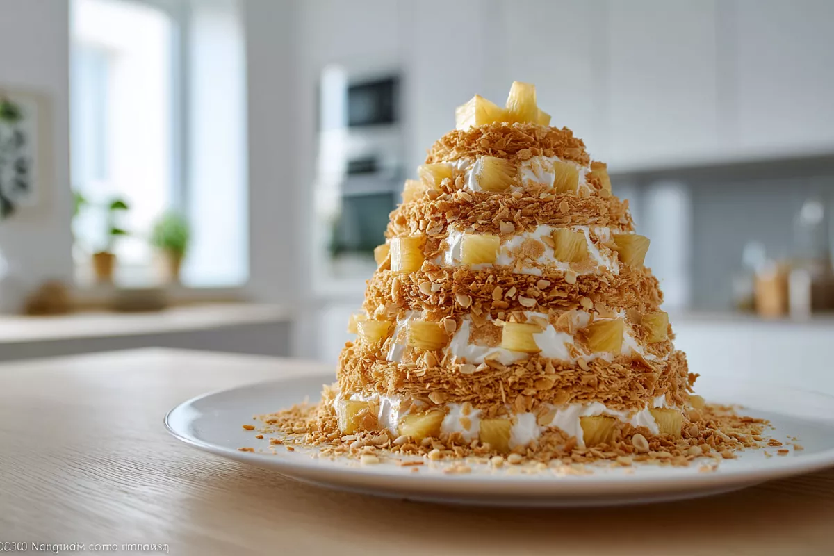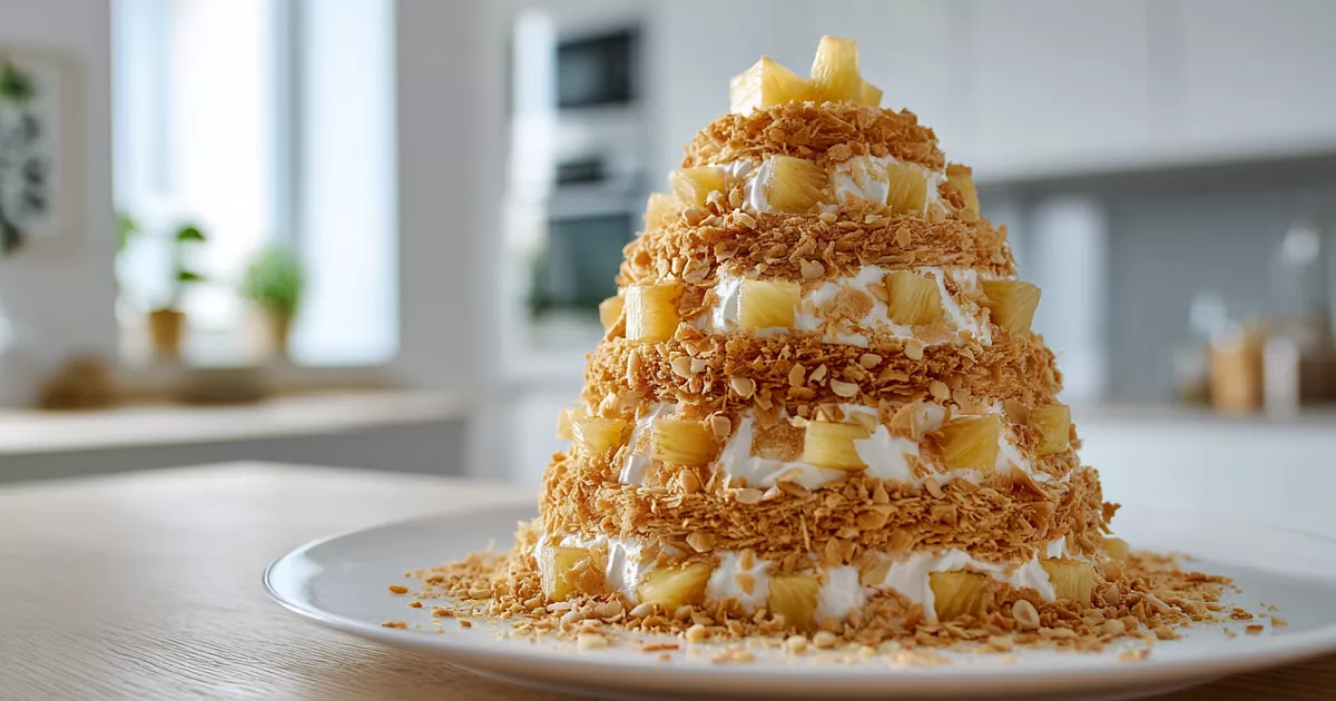 Этот эффектный торт сочетает хруст слоёного теста «Наполеона» и форму «Панчо». Крем нежный, с ананасом и орехами — готовится быстро, а результат впечатляет.