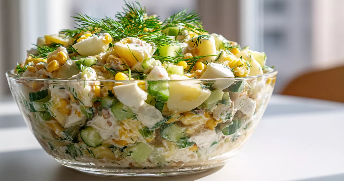 Салат готов сразу — не требует пропитки. Можно добавить 100 г мягкого сыра для сливочности. Подаём охлаждённым.