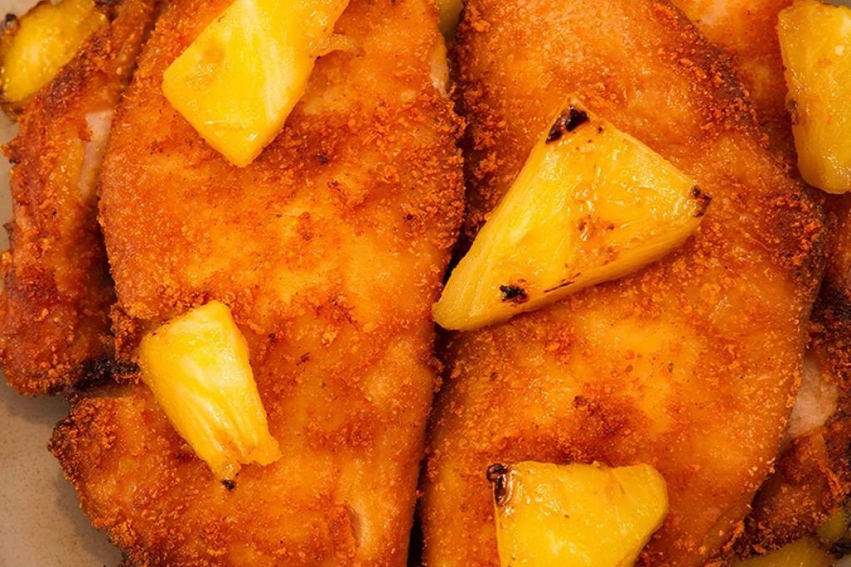 Ингредиенты: Куриная грудка — 600 г (примерно 2 шт.); Соль — ½ ч. л. + для вкуса; Черный молотый перец — по вкусу; Красный молотый перец (не острый) — по вкусу; Консервированные ананасы (кусочками) — 1 банка (около 400–500 г); Сыр (Моцарелла, Российский, Гауда) — 100 г; Сметана — 2–3 ст. л.; Майонез — 2–3 ст. л. Растительное масло — для жарки