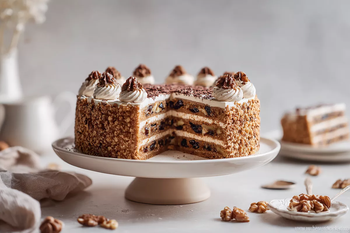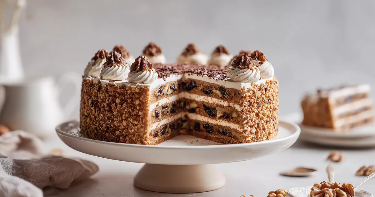 Этот изысканный торт на рассыпчатом тесте с черносливом, орехами и кремом на ликёре получается мягким, ароматным и очень вкусным.