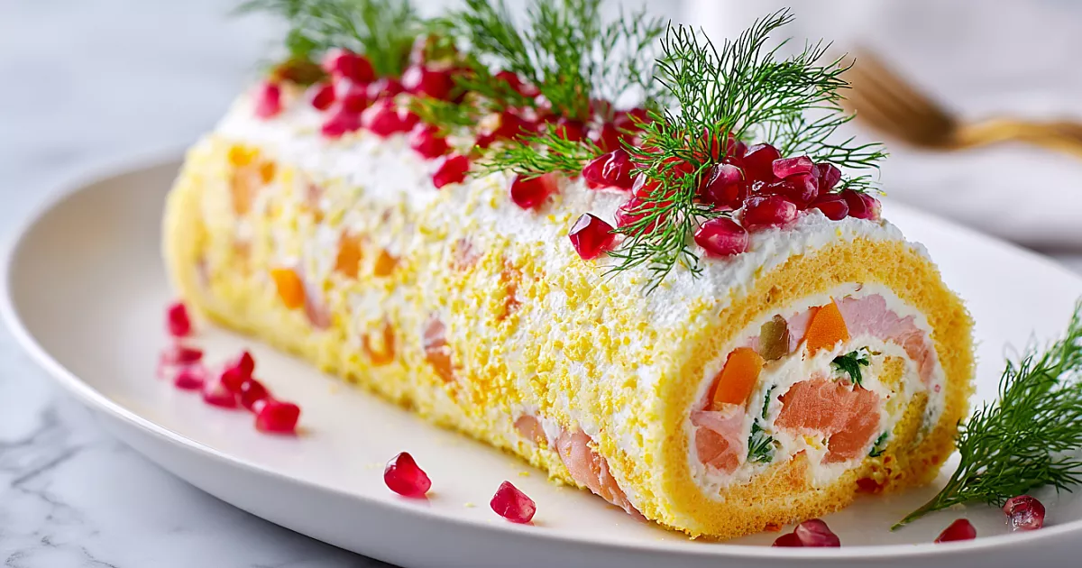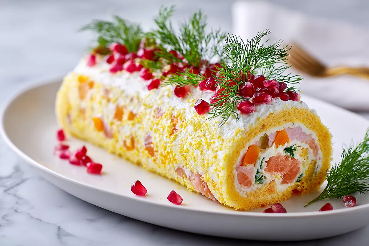 Аккуратно сворачиваем рулет с помощью плёнки, переносим на блюдо и снимаем плёнку. Украшаем натёртым желтком, свежим укропом в форме ёлочки и зёрнами граната как новогодними шариками.