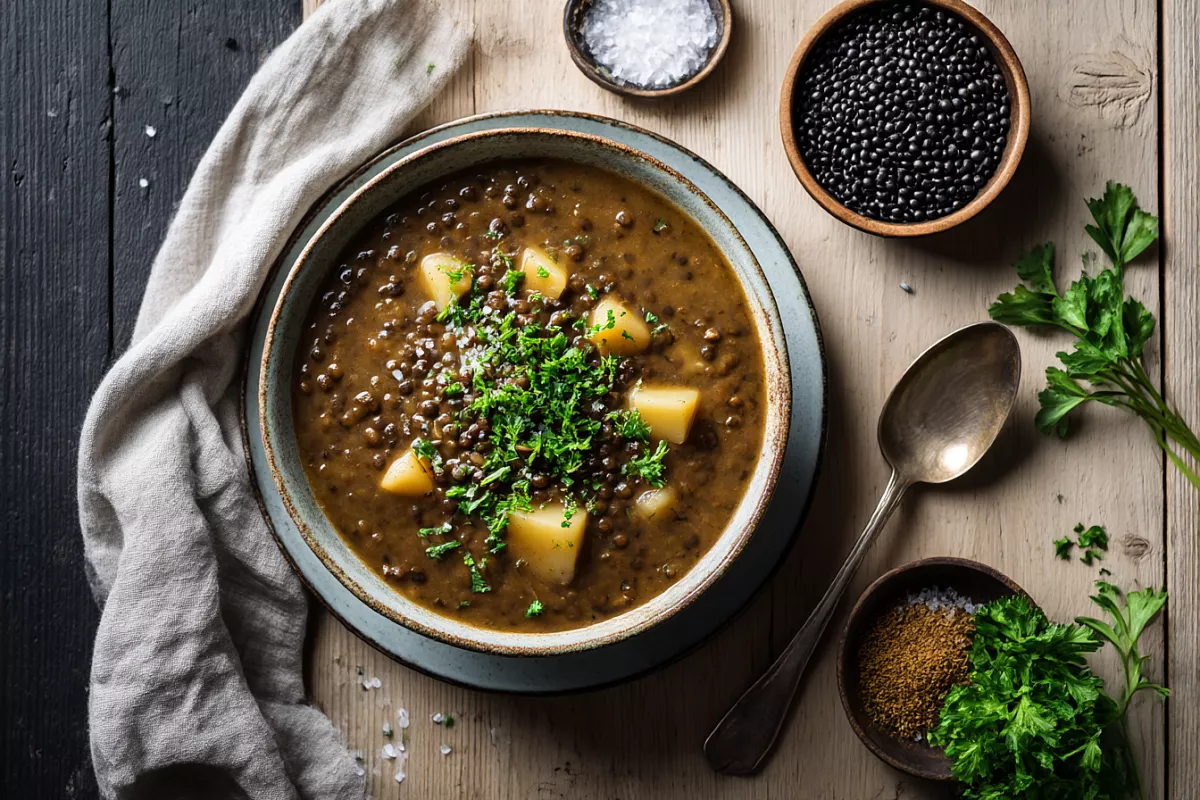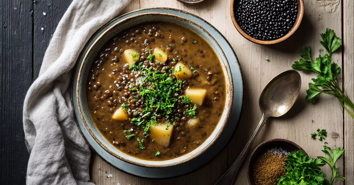 Чёрная чечевица даёт супу особую плотность и насыщенный землистый вкус.