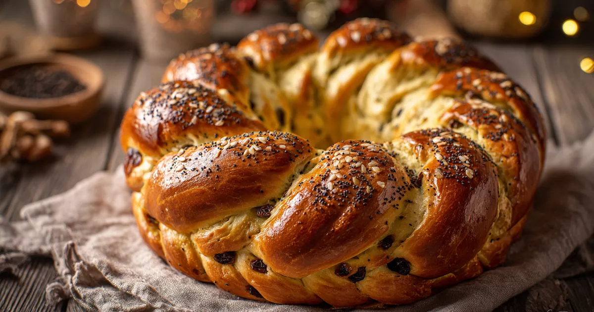 Рождественский калач — красивая и ароматная выпечка к празднику. Тесто опарное, мягкое, с изюмом внутри плетёнки.