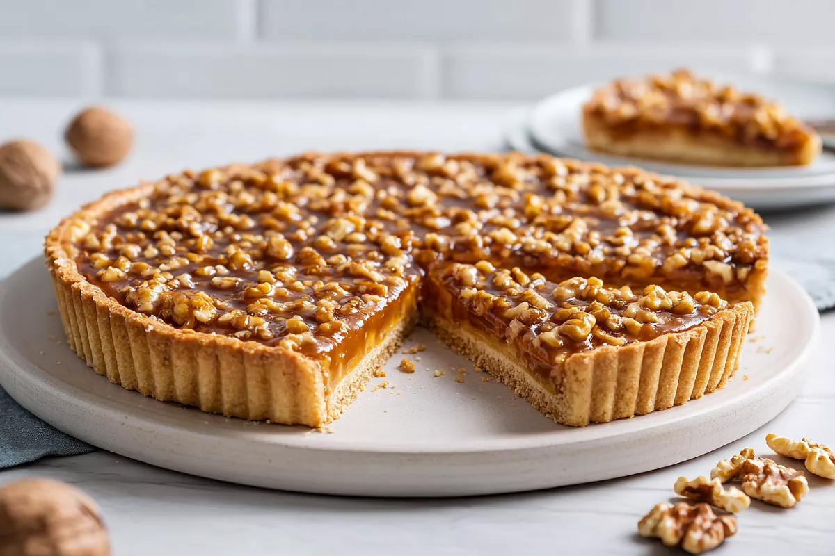 Нежный песочный пирог с орехами и сгущёнкой — быстрый десерт к чаю. Корочка рассыпчатая, начинка карамельная и ароматная.