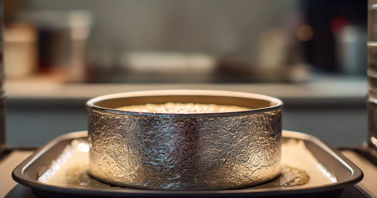 Кольцо 16 см (высотой 8–12 см) оборачиваем фольгой снизу. Устанавливаем на противень с пергаментом. Выливаем тесто, разравниваем.
