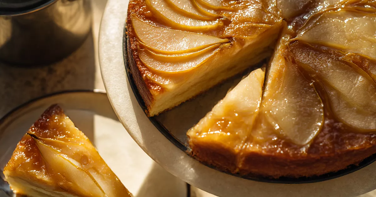 Тесто как для пирога. На дно формы, смазанной сливочным маслом и посыпанной сахаром, выкладываем тонкие ломтики груши внахлёст. Слегка присыпаем крахмалом. Заливаем тестом. Выпекаем при 180 °C 35–40 минут. Остужаем, переворачиваем. Разрезаем на коржи, пропитываем лимонадом, прослаиваем заварным кремом на лимонаде и сливочном масле. Украшаем крошкой.