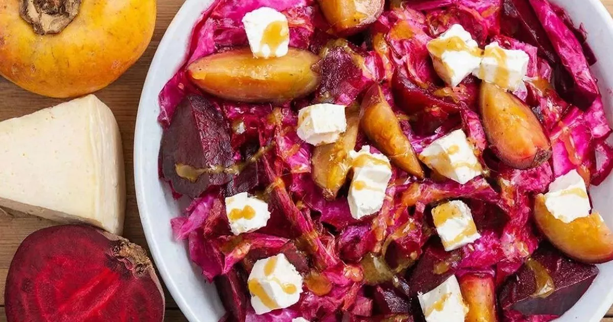 Яркий салат из запеченной свеклы с хурмой, брынзой и зерновой горчицей. Рецепт с лайфхаком для идеального баланса сладкого и соленого.