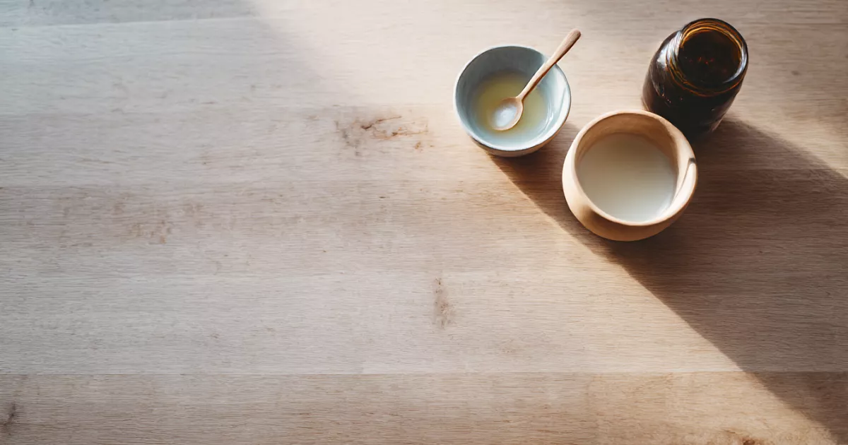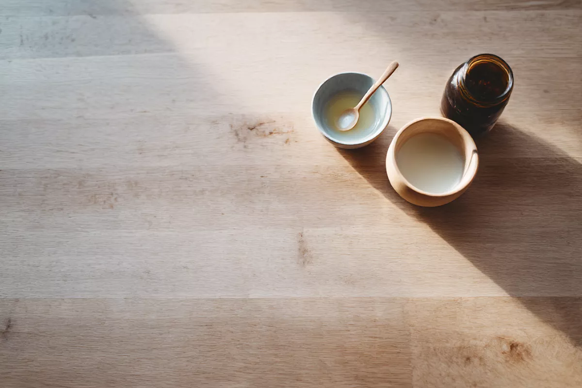 Смешиваем 1 ст. л. кокосового масла и 1 ст. л. уксуса или лимонного сока. Тщательно перемешиваем. Наносим тонким слоем на светлую древесину мягкой тканью, слегка втираем. Через 10 минут убираем остатки сухой тряпкой.