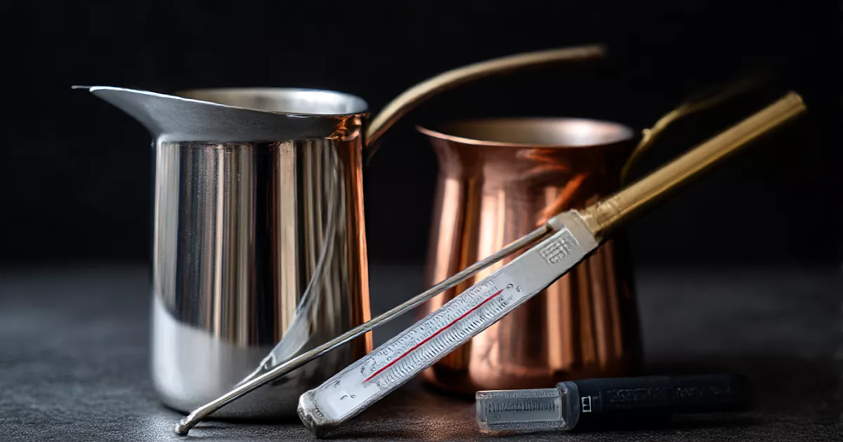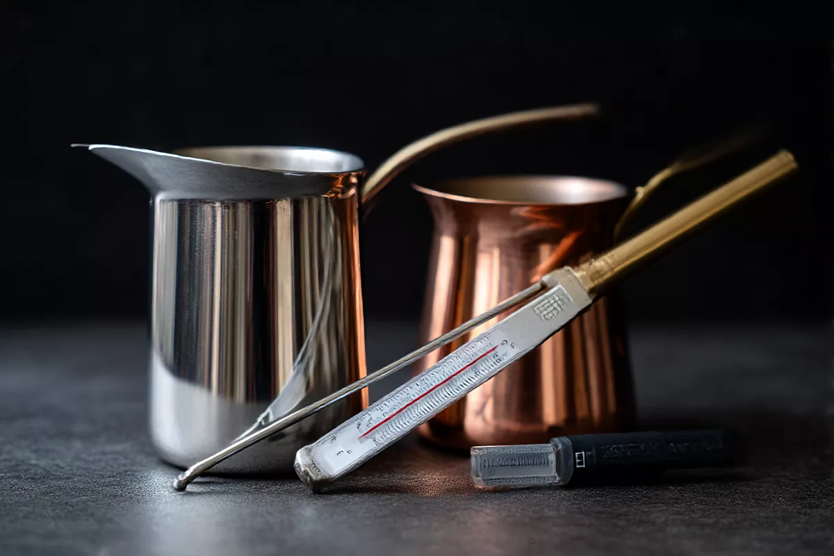 Второе — вкус. Толстостенная медная турка (а особенно серебряная) держит тепло равномерно. Тонкостенная быстро перегревает нижний слой кофе — легко словить переэкстракцию, горечь. Толстая набирает тепло медленно, отдаёт равномерно — кофе получается чище, мягче, прощает ошибки с помолом и пламенем. Широкая форма даёт тонкую кофейную таблетку — экстракция лучше, можно варить крупнее помол, меньше мешать — всё равно получится хорошо.