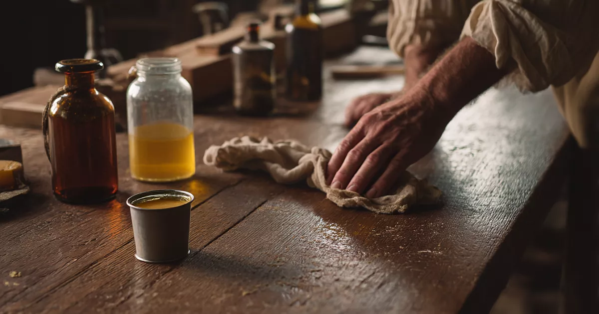 Химия проста: воск — гидрофобные молекулы, вода не прилипает. Льняное масло несёт воск вглубь дерева. Скипидар делает смесь удобной. Получается гибкое, дышащее, водоотталкивающее покрытие. Современные лаки — жёсткие, лопаются, когда дерево двигается.