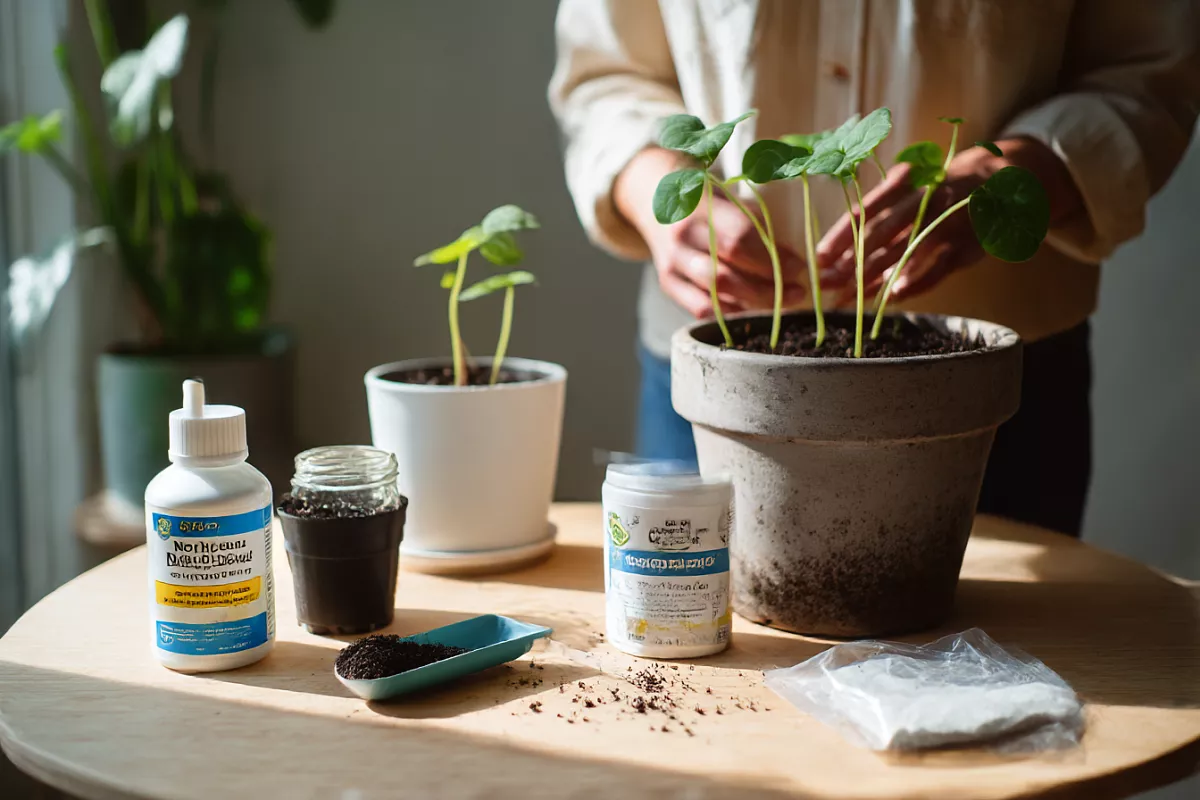 Сначала снимите верхний слой почвы 2–3 см — там обычно прячутся личинки. На средний горшок равномерно рассыпьте 1 ч. л. сухих чесночных гранул (продаются в любом магазине, стоят копейки). Чеснок — природный антисептик, он дезинфицирует грунт и не даёт вредителям размножаться. Затем в 1 л воды растворите 1 ст. л. 3%-й перекиси водорода из аптеки. Хорошо размешайте и обильно опрыскайте поверхность земли этим раствором — он уничтожает личинок и очищает почву. Сверху досыпьте свежий грунт до прежнего уровня. Через несколько дней мошки пропадают полностью.