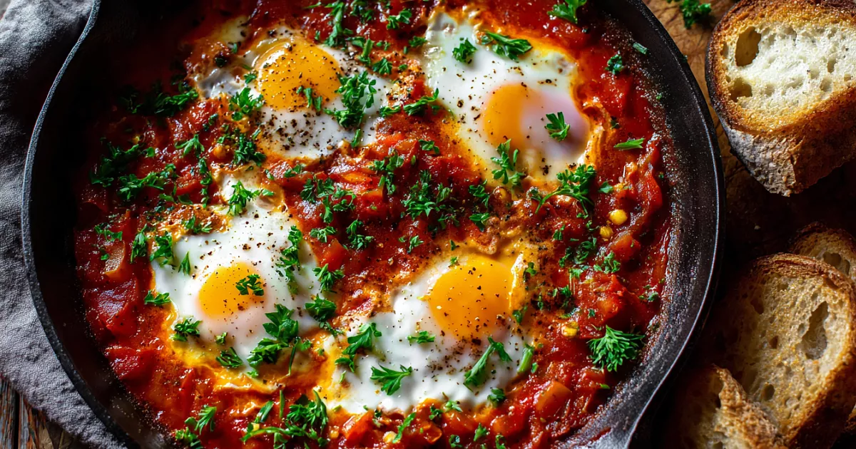 Быстрый и ароматный завтрак или лёгкий ужин — шакшука в одной сковороде, с сочным томатным соусом и жидкими желтками.