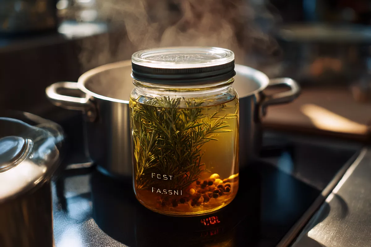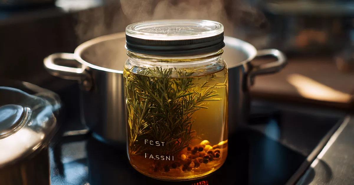 Возьмите 4–5 веточек свежего розмарина, измельчите и положите в чистую банку. Добавьте 3 ст. л. молотой гвоздики — она усиливает кровоток и даёт антисептический эффект. Залейте 80 мл оливкового масла и 80 мл кокосового. Закройте крышкой и нагревайте на водяной бане 40 минут. Дайте полностью остыть, процедите через марлю и сито.