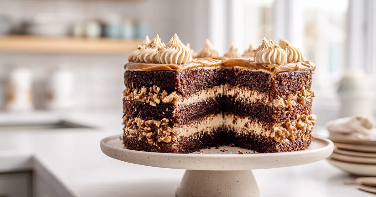 800 г сметаны заранее отвешиваем на сите (лучше с вечера) — лишняя жидкость стечёт, сметана станет густой. Смешиваем с 380 г варёного сгущённого молока и 1 ст. л. какао с горкой — крем получается карамельно-шоколадным и нежным. 150 г грецких орехов подсушиваем на сухой сковороде и рубим ножом. Собираем торт в разъёмном кольце: корж — 5 ст. л. крема — орехи, повторяем слои. Последний корж покрываем кремом, бока тоже смазываем. Сверху посыпаем орехами по краю. Убираем в холодильник на 2 часа — торт пропитается и станет ещё вкуснее.