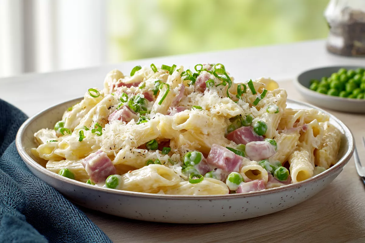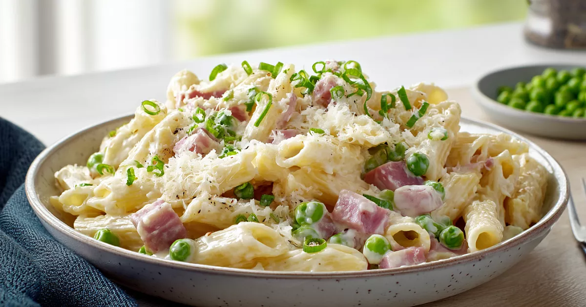 Очень вкусные и сытные макароны в нежном сливочном соусе с ветчиной, горошком и пармезаном — идеальный ужин или обед без лишних хлопот.