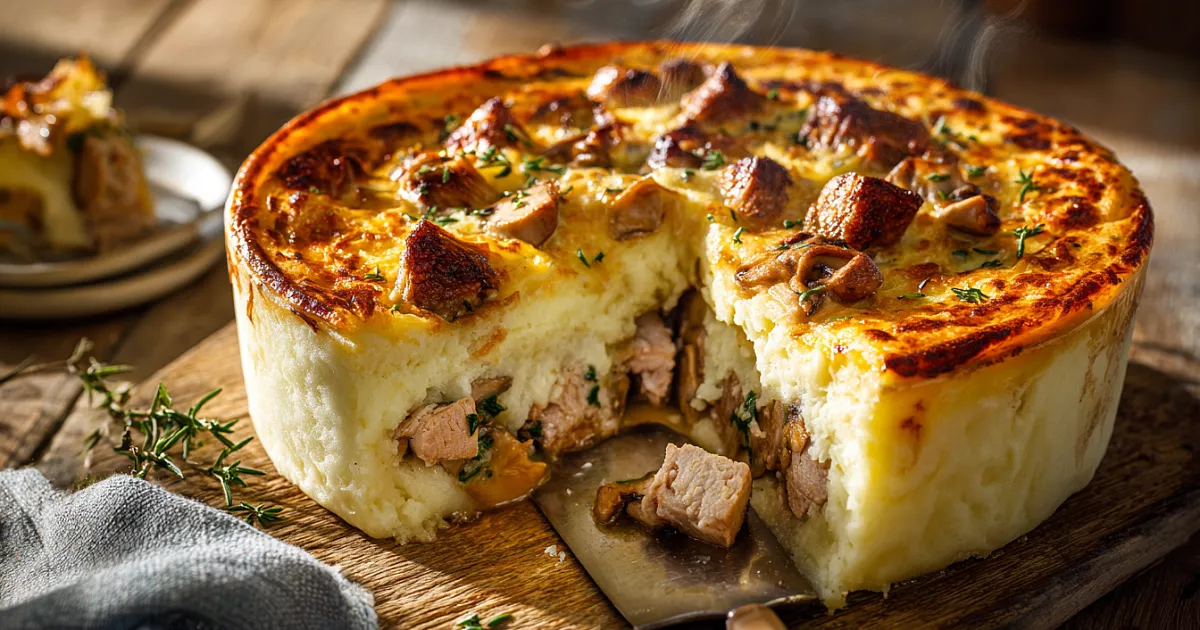Необычный и очень вкусный пирог без теста — картофельная основа, мясо с грибами и кремовая заливка, получается как пюре с подливкой.