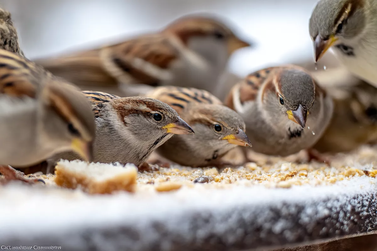 Снег идёт, кормушки полные, воробьи облепили всё. Полевые и домовые активно клюют хлеб и другие корма. Многие спрашивают: зачем их подкармливать, если их и так много?