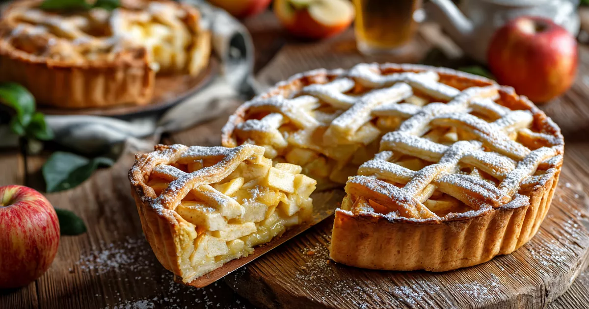 Яблоки 4 шт нарезаем кубиками, добавляем 3 ст. л. сахара и 1 ч. л. корицы. Томим под крышкой на среднем огне 15 минут до мягкости. Творог 300 г смешиваем со 150 г сахара, 2–3 ст. л. манки, ванилином и сметаной. Взбиваем до гладкости. Взбиваем 2 белка до лёгких пиков, постепенно добавляем к творожной массе. Остывшее тесто делим на две части: большую раскатываем и переносим в форму диаметром 22 см, формируем бортики. Выкладываем яблоки, сверху — творожную начинку. Из оставшегося теста делаем полоски и оформляем решётку. Смазываем желтком с водой.