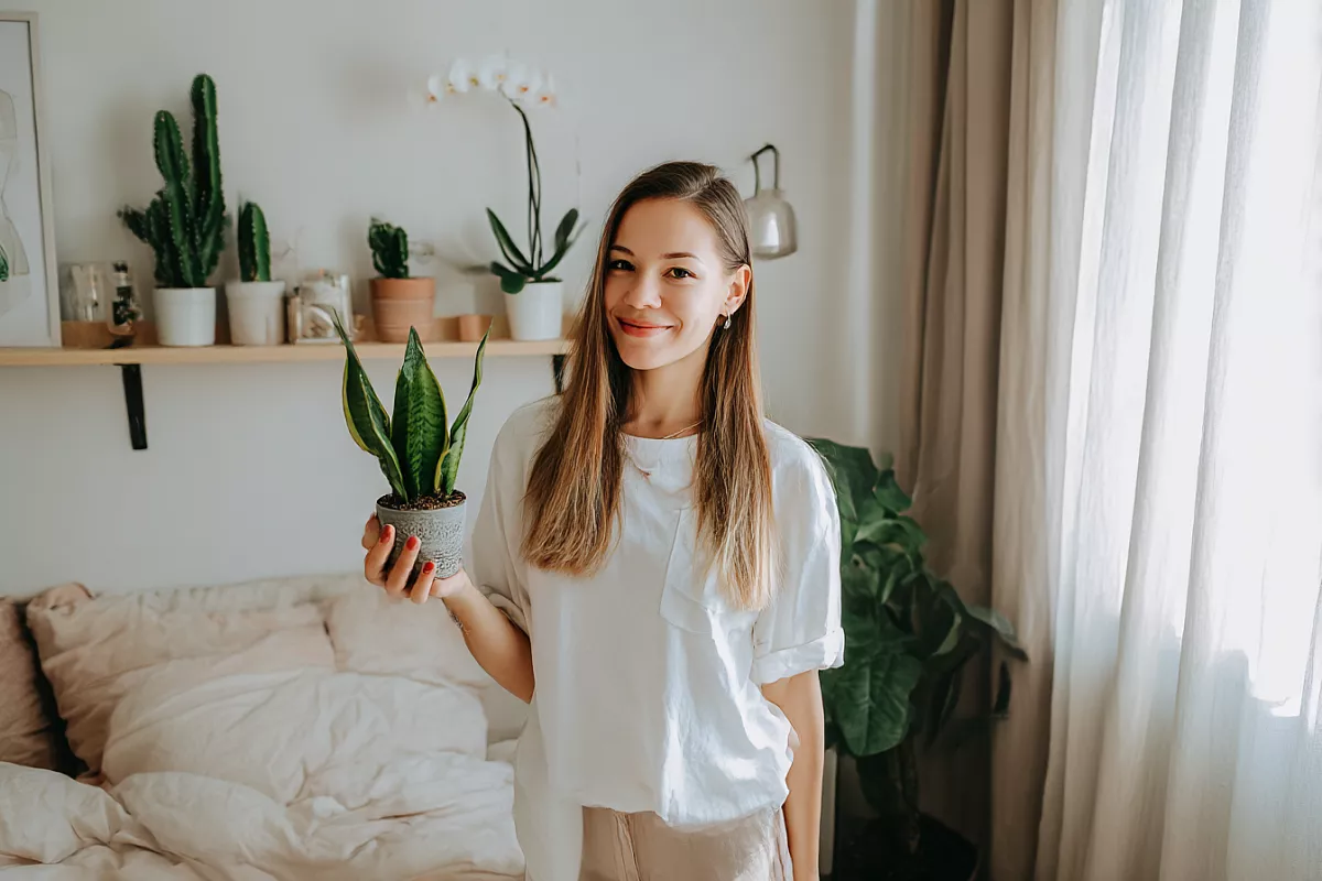 Первое растение — сансевиерия, её ещё называют «тёщин язык». Её ценят за выносливость и плотные листья, она спокойно переносит редкий полив. Часто её выбирают и потому, что у растений с САМ-типом обмена ночью идёт активный газообмен.