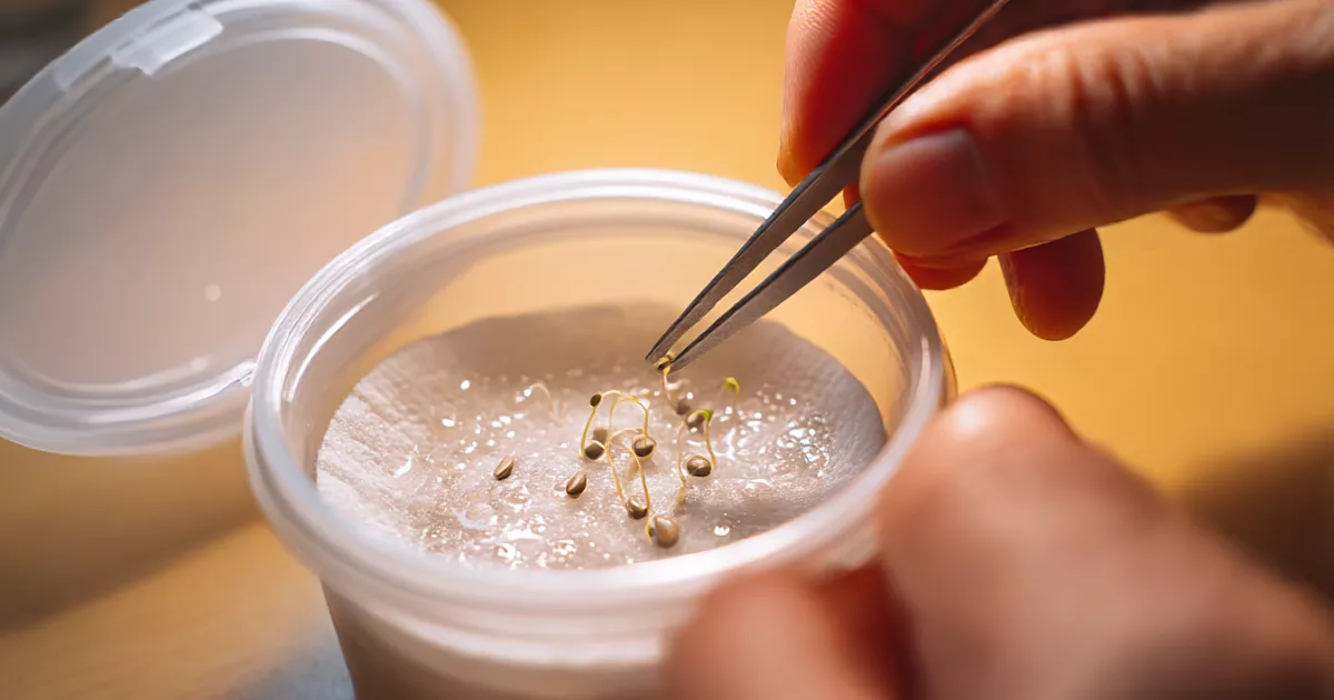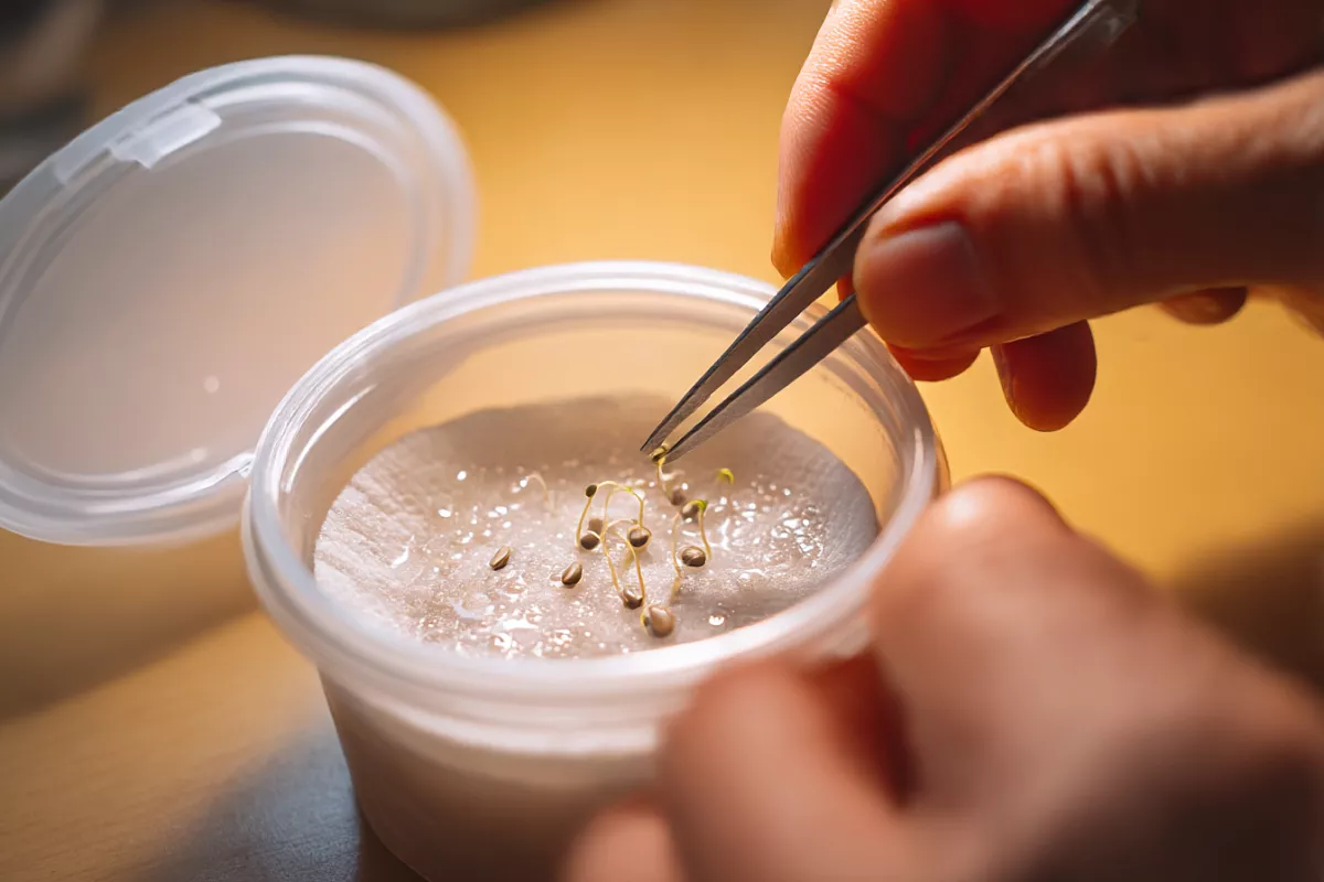 В середине февраля ставлю семена на проращивание во влажных ватных дисках, смоченных тёплой дождевой водой. Диски кладу в контейнер с крышкой и держу при 27°C. На 8-е сутки корешки появляются у всех сортов, тогда отбираю самые сильные семена.