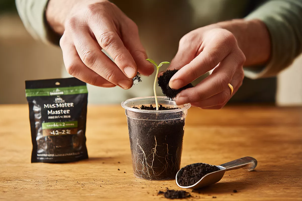 Перед подсыпкой аккуратно отщипываю семядольные листочки и добавляю грунт. Дальше снова жду, пока корни освоят новый слой, и планирую третью подкормку комплексным удобрением.