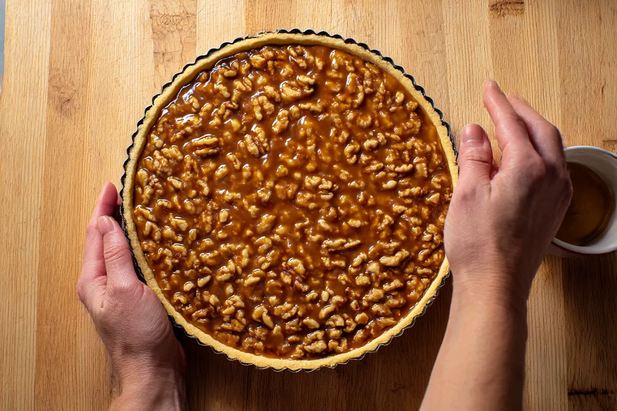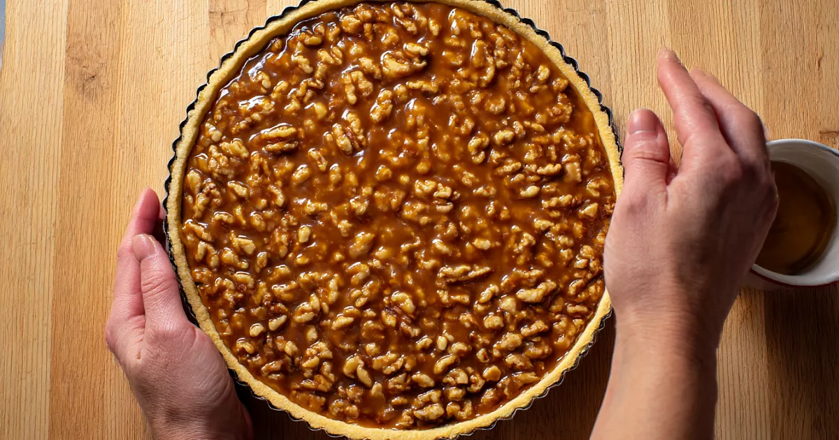 Это рассыпчатый пирог с орехами и карамельной заливкой, который хорошо держит вкус даже на следующий день.