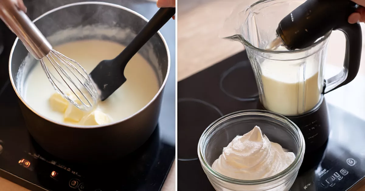 Теперь важный момент. Чтобы молоко и жир соединились, делаем эмульсию. Для этого нужен блендер с ножами, а не миксер. Сразу горячую смесь пробиваем блендером на максимальной скорости 5–10 минут, пока масса не станет однородной и не исчезнет разделение на масло и молоко.