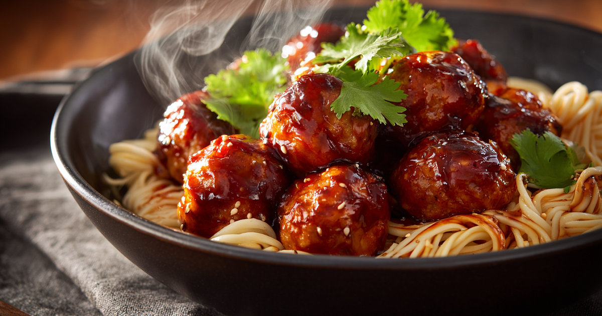 В этот же бульон варим яичную лапшу до готовности. Сливаем, поливаем каплей масла, чтобы не слиплась. Выкладываем лапшу в тарелку, сверху — фрикадельки, поливаем горячим соусом. Украшаем кинзой. Соус обволакивает всё блестящей глазурью, фрикадельки нежные, а вкус — сладко-солёно-кислый с пряной ноткой.