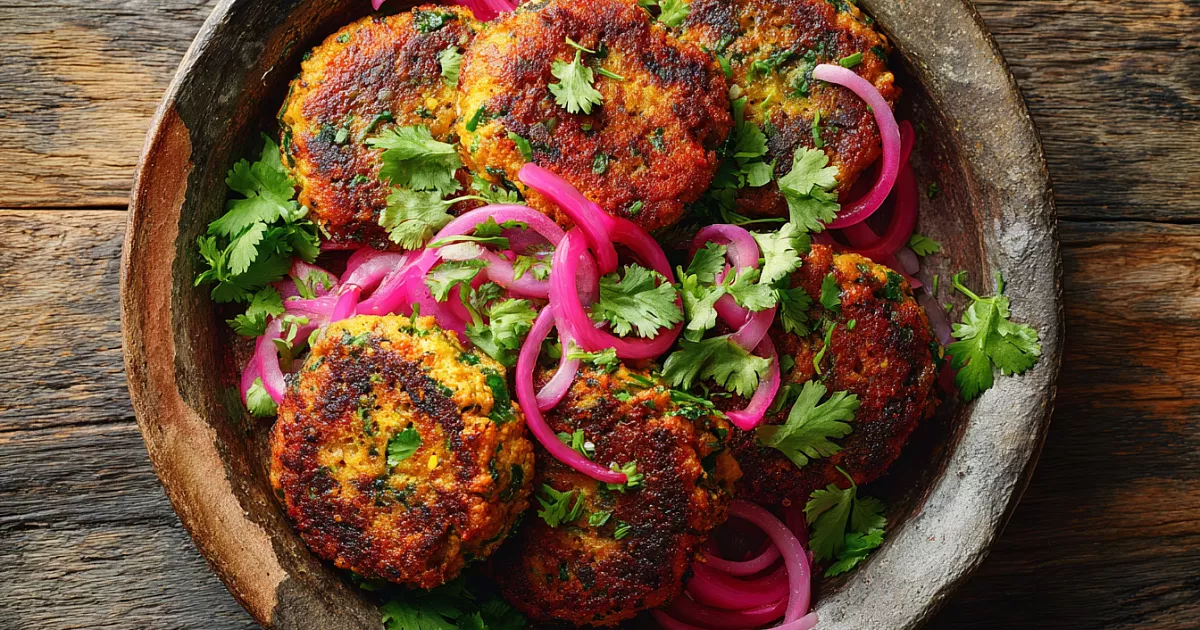 Пока котлеты готовятся, режем красный лук тонкими полукольцами. Добавляем 1 ст.л. сахара, 1,5 ст.л. лимонного сока, ½ ч.л. соли и рубленую кинзу. Перемешиваем и оставляем мариноваться 5 минут. Лук выходит хрустящим и очень вкусным — идеально к котлетам.