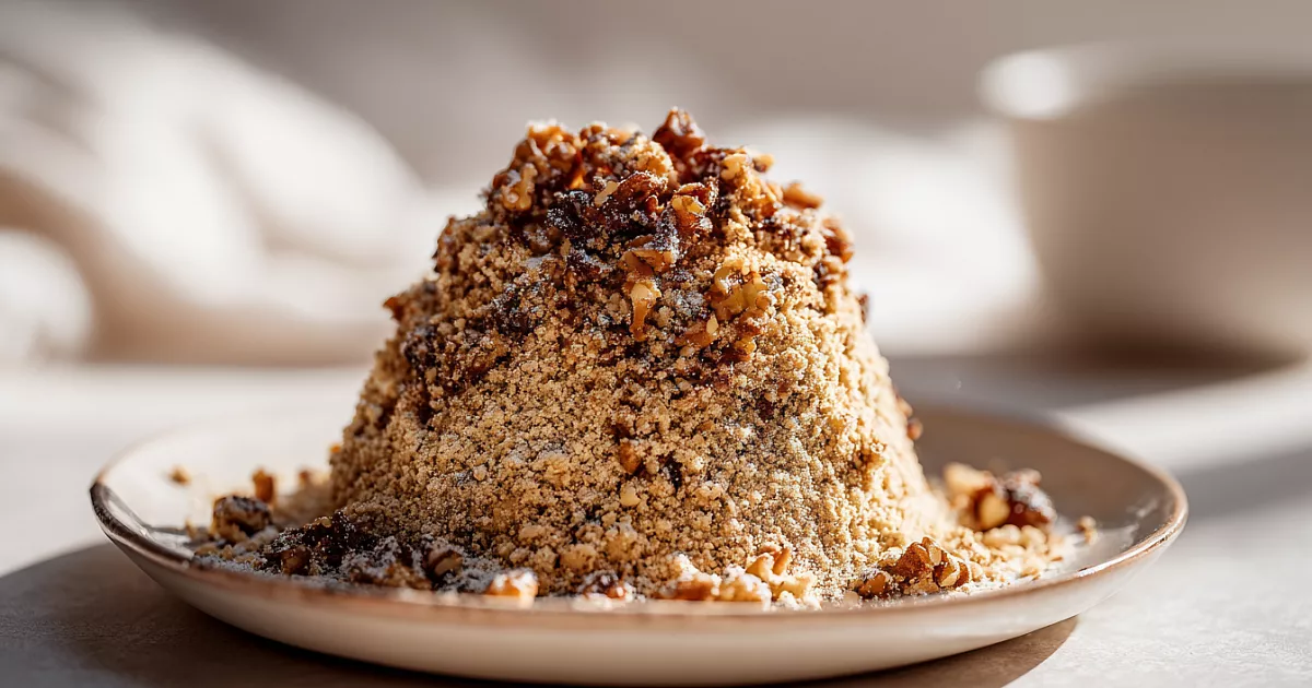 200 г мягкого сливочного масла взбиваем с 350–380 г варёной сгущёнки до воздушной гладкой массы. Грецкие орехи 100 г дробим в пакете скалкой и добавляем в крем. Остывшее тесто ломаем руками, перемешиваем с кремом, чтобы каждый кусочек пропитался. Форму застилаем плёнкой, выкладываем массу горкой, утрамбовываем. Накрываем плёнкой, ставим груз и убираем в холодильник минимум на 2 часа — лучше дольше.