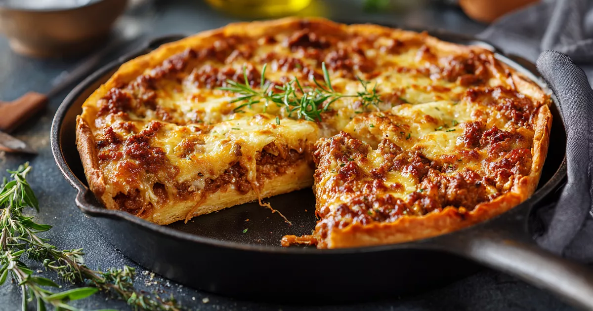 Горячий пирог получается сочным, с тянущимся сыром и ароматным фаршем. Режется отлично, пахнет потрясающе. Подавайте к чаю или как самостоятельное блюдо — всем понравится.