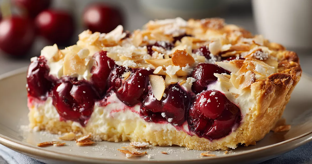 Этот пирог получается очень вкусным, мягким и ароматным. Вишня даёт приятную кислинку, сметанный крем — нежность, а миндальные лепестки — красивую корочку.