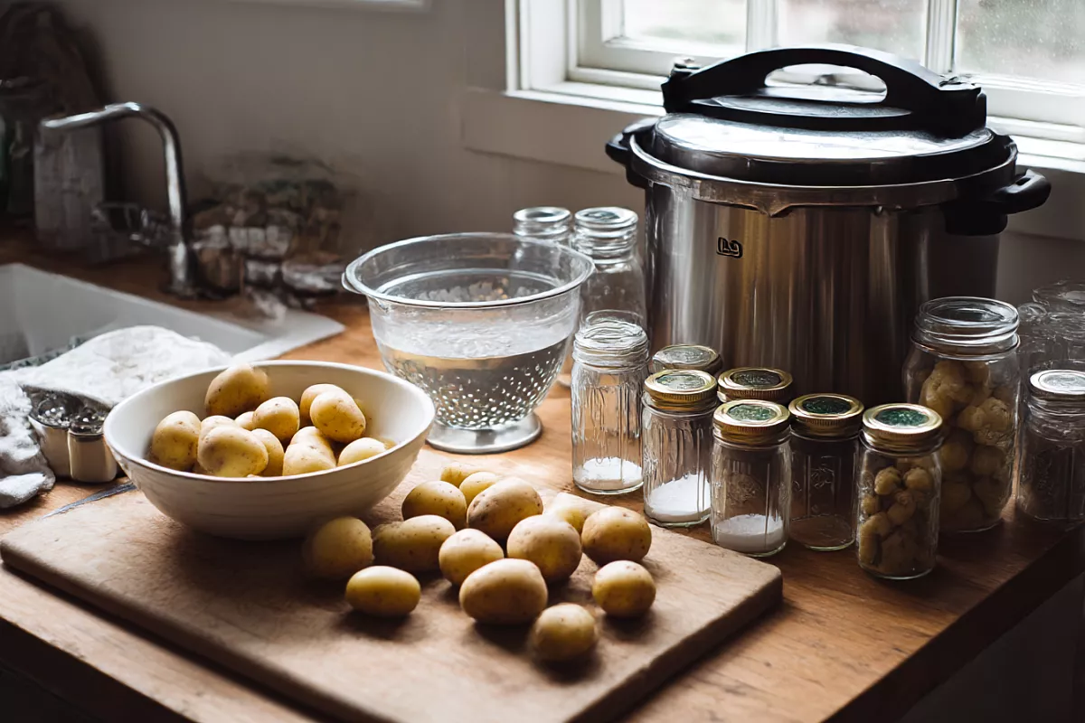 Картофель очищают, нарезают и плотно укладывают в банки без добавления воды. Стерилизуют в скороварке. Получается надёжная заготовка со сроком хранения до 5 лет.