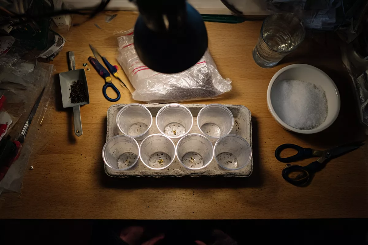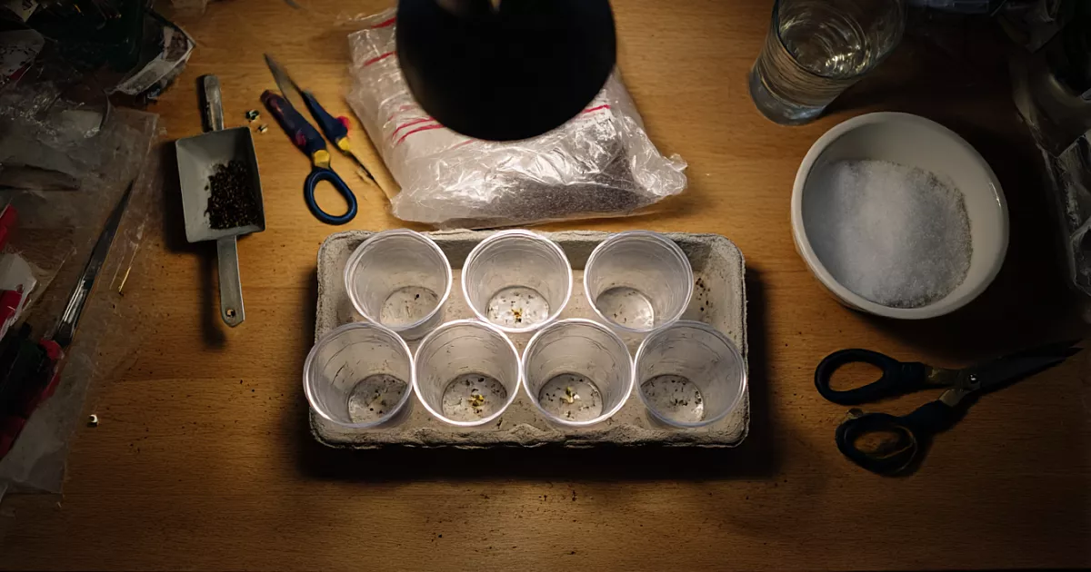 Поставьте стаканчики в высокий контейнер, накройте крышкой или плёнкой для влажности. Держите при 25–30 °C. Сверху — лампа 25–30 Вт на расстоянии 10–20 см. Первые 2–3 дня лампу можно не выключать. Всходы появляются на 2–3 день.