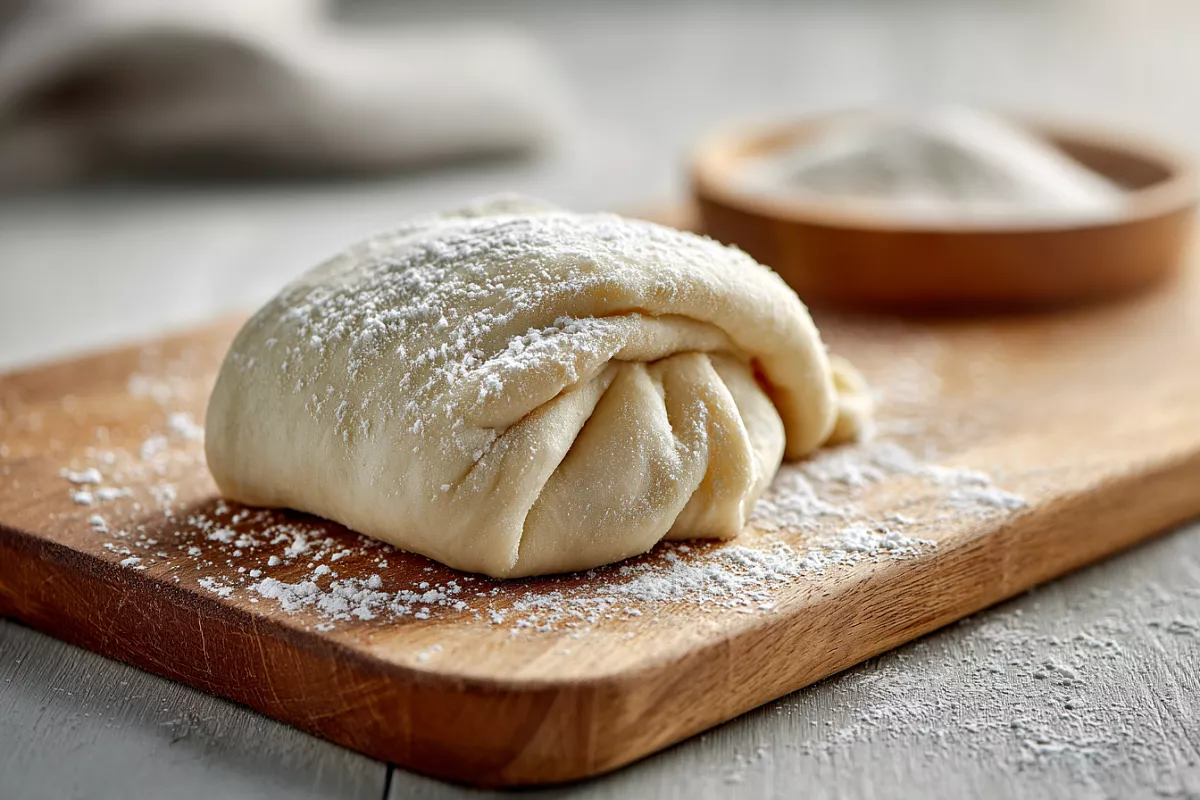 Просеиваем в большую миску 420 г муки. Вливаем жидкую основу и начинаем перемешивать ложкой или лопаткой, чтобы мука полностью впитала влагу. Когда масса соберётся в комок, перекладываем на стол и вымешиваем руками 5–7 минут. Тесто сначала будет рваным и тугим — это нормально. Главное — не добавлять муку сверх меры. Готовое тесто получается плотным, но пластичным. Заворачиваем в плёнку и оставляем отдыхать при комнатной температуре на 30 минут (или в холодильнике до 24 часов). За это время клейковина набухнет, тесто станет гладким и очень эластичным.
